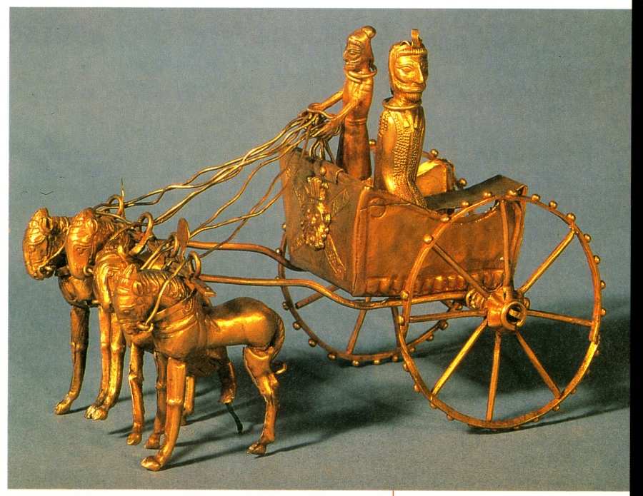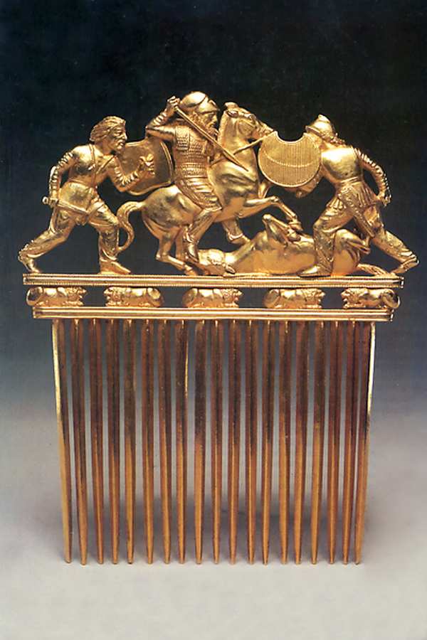 И еще одно замечание. Осмотр выставки "Золотые олени Евразии", а также золотой кладовой в Санкт-Петербурге, в Эрмитаже, золотых находок в Каирском музее в Египте позволяет нам высказать подозрение, что количество подлинных золотых находок - по-видимому, весьма скромное - в некоторых случаях искусственно "увеличивалось" за счет подделок. То есть обществу предъявлялась смесь подлинных находок и подделок "под древность". Причины можно понять. Раскопки надо было окупать. Первоначальные поиски часто производились состоятельными любителями древности в общем-то за свой счет. Поэтому им надо было как-то вернуть деньги. Или даже заработать. Золото, превращенное в "очень древние" ювелирные украшения, естественно, резко взлетало в цене. И его можно было сбыть музеям за баснословные деньги. Подлинные золотые находки, часто очень невзрачные и плохо сохранившиеся, не могли произвести такого впечатления и быть проданы за такие же деньги, как и роскошные подделки. До сих пор, когда речь идет, например, о скифском золоте, наиболее популярные, рекламируемые образцы, кочующие из альбома в альбом и превратившиеся в нашем сознании как бы в марку "скифского стиля" - это, скорее всего, подделки. Мы видим шикарные золотые колчаны и ножны, покрытые "античными" сценами, "античную" корону с подвесками. Пресловутый золотой гребень, кстати, "прекрасно сохранившийся", рис.2.6. Его тонкие изящные зубцы даже не погнулись! За якобы протекшие много сотен лет. Гребень тоже изображает "античные" позы, римские мечи и шлемы. Складывается впечатление, что все это срисовано со страниц современных учебников по истории. Ювелирная техника таких изделий типична для XIX-XX веков.