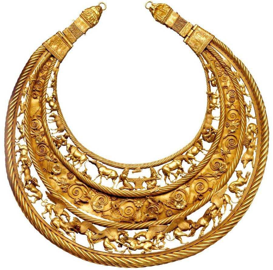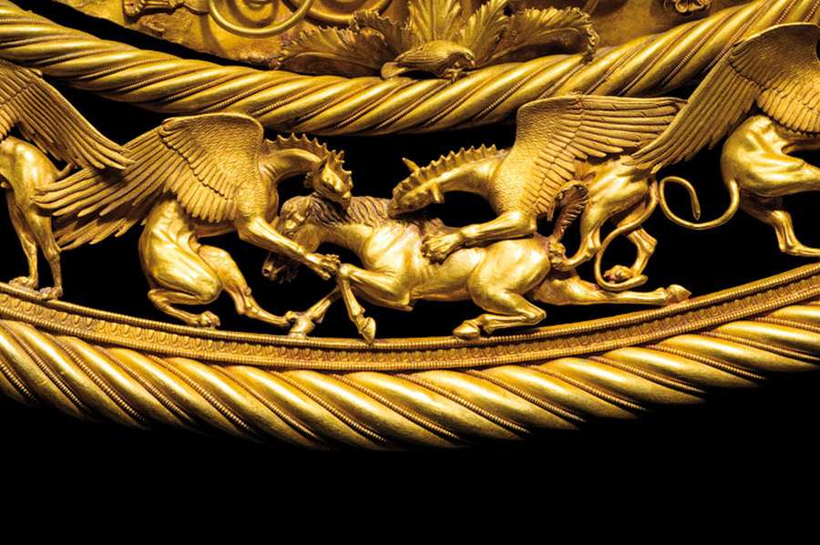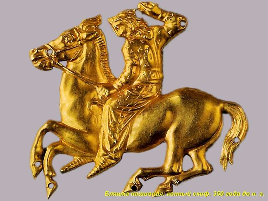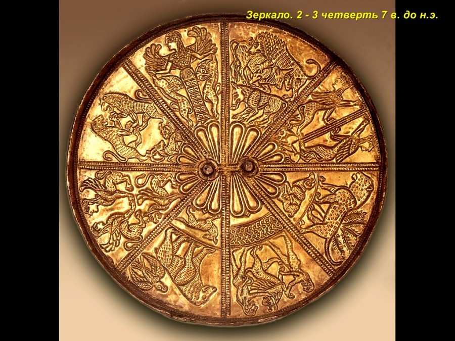 Но тут мы вспоминаем, что кружка "античного скифа" происходит из коллекции графа А.С.Уварова. То есть найдена в кургане. Судя по всему, в донском кургане, как это сказано в музейной табличке. А граф Уваров копал в середине XIX века. И выкопал кружку столетней давности. Следовательно, по крайней мере, один из раскопанных им скифских курганов насчитывал не более ста лет. И, согласно нашей реконструкции, это вполне возможно, поскольку до конца XVIII века существовала огромная Московская Тартария. В которой, по нашему мнению, и производились те золотые скифские украшения в "зверином стиле", которые сегодня относят к античным временам и приписывают каким-то загадочным "древним" скифам. А на самом деле, это изделия ордынско-казацкой-татарской культуры XIV-XVIII веков. И многие из них датируются XVII-XVIII веками.