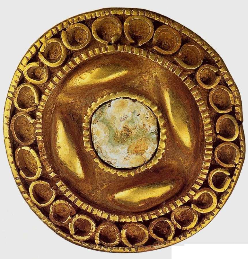 Согласно табличке, это - "Сосуд с зооморфной ручкой. Золото, кораллы, стекло. I в.н.э. Нижний Дон, бывшая Донская область, Усть-Медведицкий район, станция Мигулинская. Собрание А.С.Уварова. ГИМ". Напомним, что граф А.С.Уваров широко известен как якобы археолог, раскопавший большое количество курганов по всей России. Например, в 1851-1854 годах только во Владимиро-Суздальской земле им было раскопано 7729 курганов [19], с.12-13.