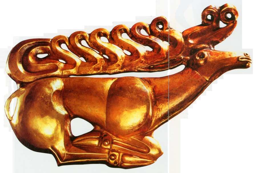 27 февраля 2003 года мы посетили выставку "Золотые олени Евразии", развернутую в Историческом Музее города Москвы (ГИМ). Здесь было выставлено несколько сотен золотых предметов из курганов Дона, Поволжья, Крыма, Северного Причерноморья, Урала и Сибири. В основном, знаменитое скифское золото, покрытое изображениями в так называемом "зверином стиле". Оно считается исключительно древним. Большинство предметов на выставке, согласно музейным табличкам, датируется первым тысячелетием до н.э. Наиболее поздние датировки - первые века н.э. Часть экспонатов была привезена из Санкт-Петербурга, часть - из Уфы. Некоторые - всего лишь несколько предметов - извлечены из запасников Государственного Исторического Музея.