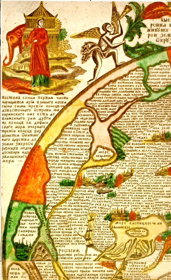 ### "Восток Солнца. Первая часть нарицается Азия. Большего Ноева сына Сима жребий. Конец сей до восточного острова Макаринскаго иже есть до блаженного Рая. Другий же конец ея до Фасискаго моря и Чернаго. Третий конец разделяется от Китайского царства до земли зверообразных людей, до Сибири и до Хвалынскаго моря".