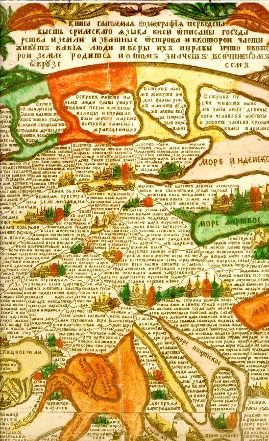 Сегодня карта находится в коллекции Государственного Исторического Музея г.Москвы. Она называется: "Космография, переведенная с Римского языка, в ней описаны государства и земли". Карта опубликована в альбоме-календаре, вышедшем в 2001 году, см. [358:1], карта 1. Как сказано в аннотации календаря, он посвящен 300-летию первой русской карты. Таким образом, по мнению историков, издавших альбом-календарь, ранее 1701 года на Руси географических карт вообще не было. Ни одной. И только начиная с эпохи Петра I Россия, дескать, стала с трудом выползать из болота темноты и невежества, ведомая прогрессивными западно-европейскими просветителями. Однако, как мы показали в книгах "Империя", "Библейская Русь", "Реконструкция", здесь историки глубоко заблуждаются. Географические карты, причем весьма подробные, в Руси-Орде XIV-XVI веков, то есть в Великой = "Монгольской" Империи, на самом деле были. И было их много. Карты изготовлялись, в частности, для имперской администрации, для войск и флота Руси-Орды = Израиля и Османии=Атамании = Иудеи. Кстати, зря нас уверяют, будто до Петра I в России не было флота, см. "Библейская Русь", гл.14. Среди имперских "монгольских" картографов, имена которых дошли до нас, упомянем, например, знаменитых Клавдия Птолемея и Абрахама Ортелия. См. подробности в нашей книге "Старые карты Великой Русской Империи. (Птолемей и Ортелий в свете новой хронологии)".