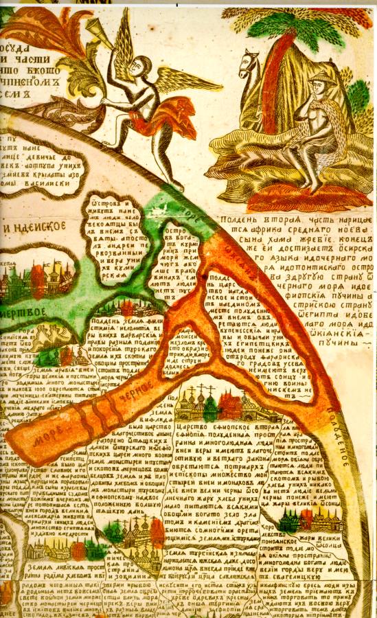 ### "Полдень. Вторая часть нарицается Африка, среднего Ноева сына Хама жребий. Конец же ей достизает Осирскаго языка и до Черного моря и до Понтийского острова с другой стороны от Черного моря, и до Ефиопской пучины. А с третьей стороны от Египта и до Белого моря и до окиянския пучины".