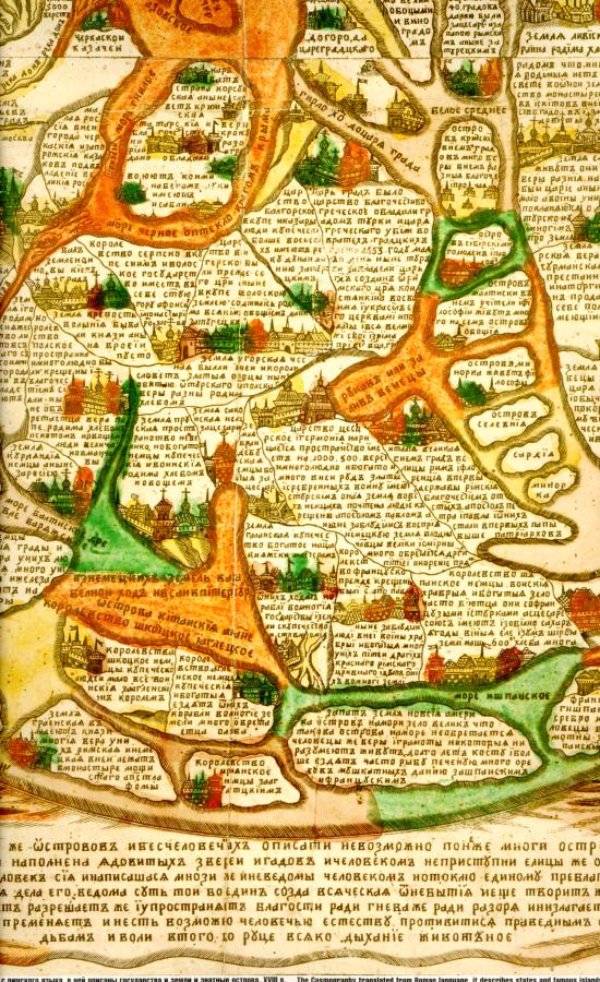 ### "Россъсия. Царство Российское Московской державы стоит на востоце и на севере. Пространо и многолюдно. Грады имеют каменные и древянные. Крещены от великого князя Владимера Киевского всея Росии в лето 6496 от Рожества христова 988".