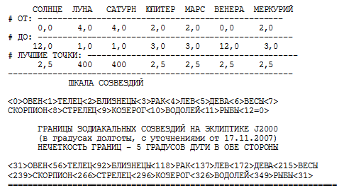 Сатурн и Луна - не в Близнецах, не в Раке и не в Тельце (вдали от Близнецов, поскольку они не изображены на зодиаке). Лучшие точки для них не определены и не участвуют в подсчете среднего отклонения.