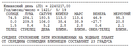 Расчеты показали, что 19 мая 1421 года. МАРС, МЕРКУРИЙ и ЮПИТЕР в точном соответствии с зодиаком FN находились в созвездии БЛИЗНЕЦОВ, прямо под звездами КАСТОРОМ и ПОЛЛУКСОМ (альфа и бета Близнецов). СОЛНЦЕ и ВЕНЕРА в тот день были в ТЕЛЬЦЕ. Формально Венера находилась в Овне, но фигура Овна в этом месте накладывается в проекции на эклиптику на фигуру Тельца, поэтому старинный астроном вполне мог счесть, что Венера была в Тельце, рис.5.118, рис.5.119. Еще две планеты древности, САТУРН и ЛУНА, находились очень далеко от Близнецов. Сатурн был в Деве, а Луна в Стрельце. Картина звездного неба 19 мая 1421 года в окрестности Близнецов, полученная с помощью астрономической программы А.Е.Завалишина StarCalc, приведена на рис.5.118. Точные значения эклиптикальных долгот планет 19 мая 1421 года, вычисленные с помощью программы HOROS, приведены в следующей таблице.