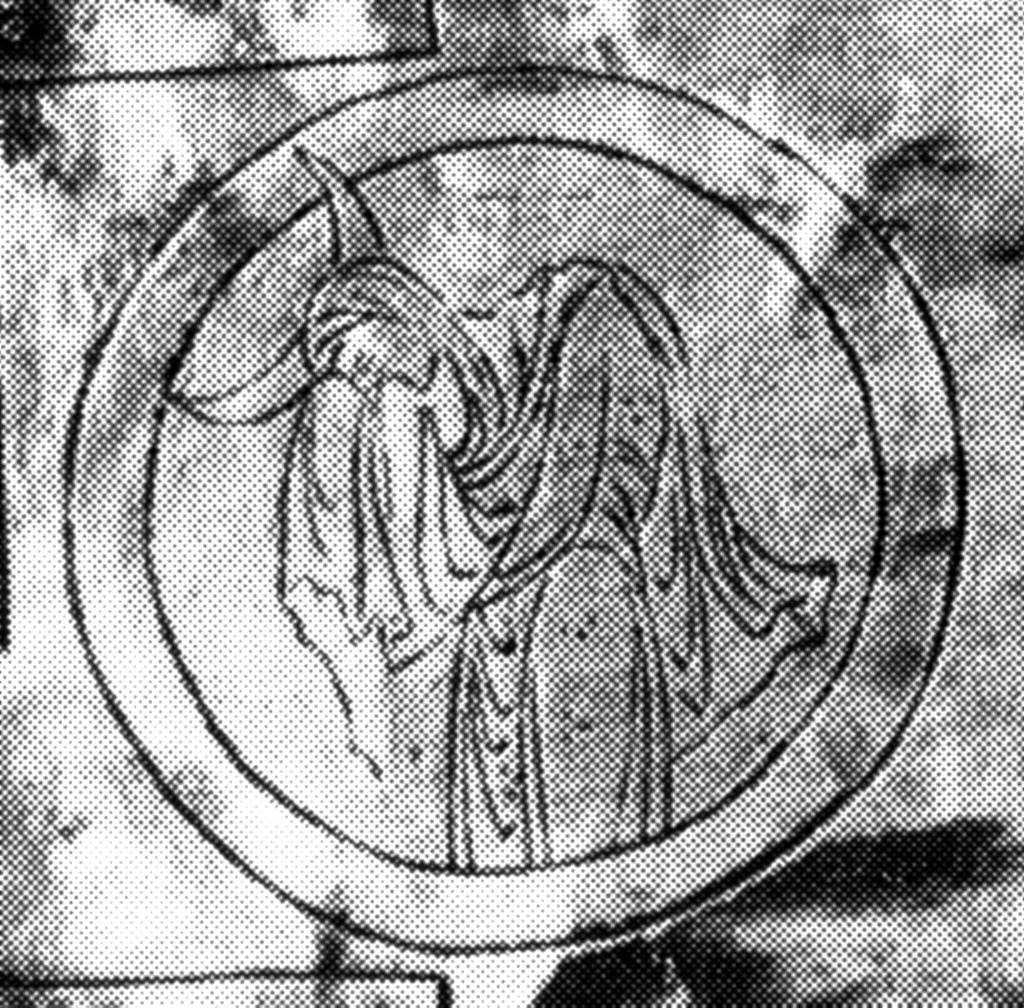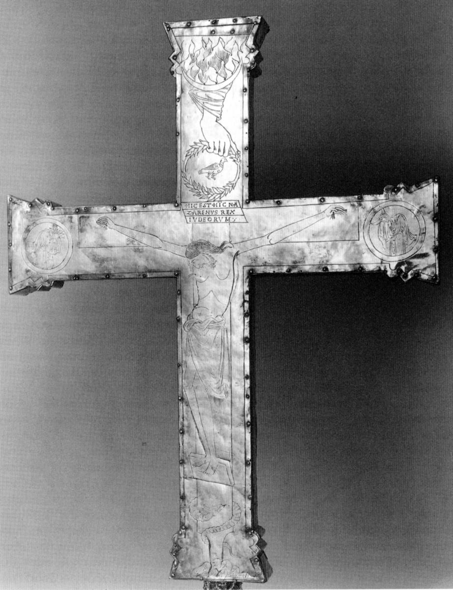 В Доме (Dom) германского города Аахена хранится одно из самых известных произведений средневекового искусства - крест императора Лотаря. Считается, что роскошный крест, украшенный драгоценными камнями, сделали около 1000 года н.э. [1165], с.89. Подробнее о нем мы скажем в дальнейших главах. Здесь же обратим внимание на оборотную сторону креста, рис.5.124. Вверху, над распятием, виден османский полумесяц, рис.5.125. Но особенно интересно изображение плачущей Богоматери Марии, склонившейся у распятия. На ее голове - большой ОСМАНСКИЙ ПОЛУМЕСЯЦ, рис.5.126. Это - очень редкое, уцелевшее до нашего времени, изображение Марии. Оно ясно показывает, что полумесяц считался важным христианским символом, с вязанным с Христом и Девой Марией. Кстати, обратите внимание на необычную, по нынешним понятиям, надпись над распятием, рис.5.125.