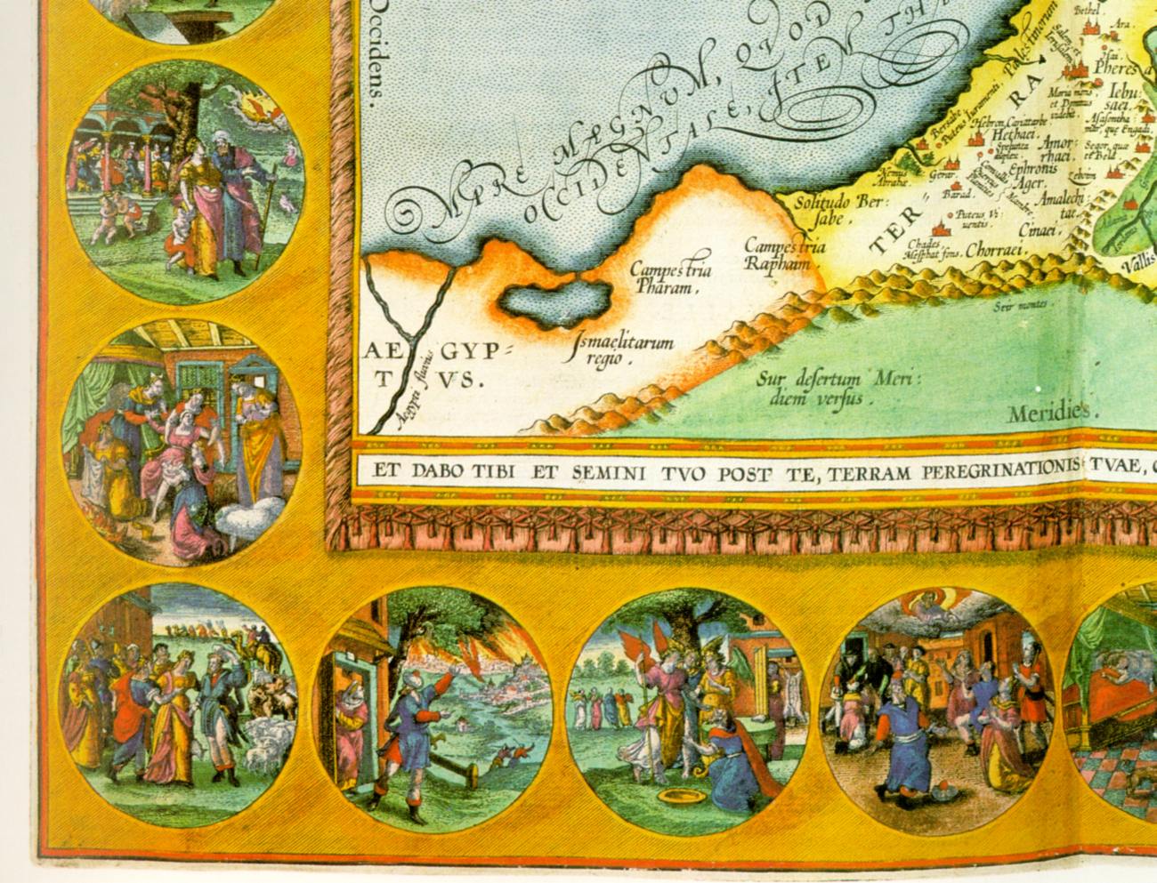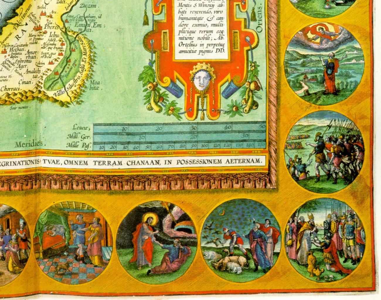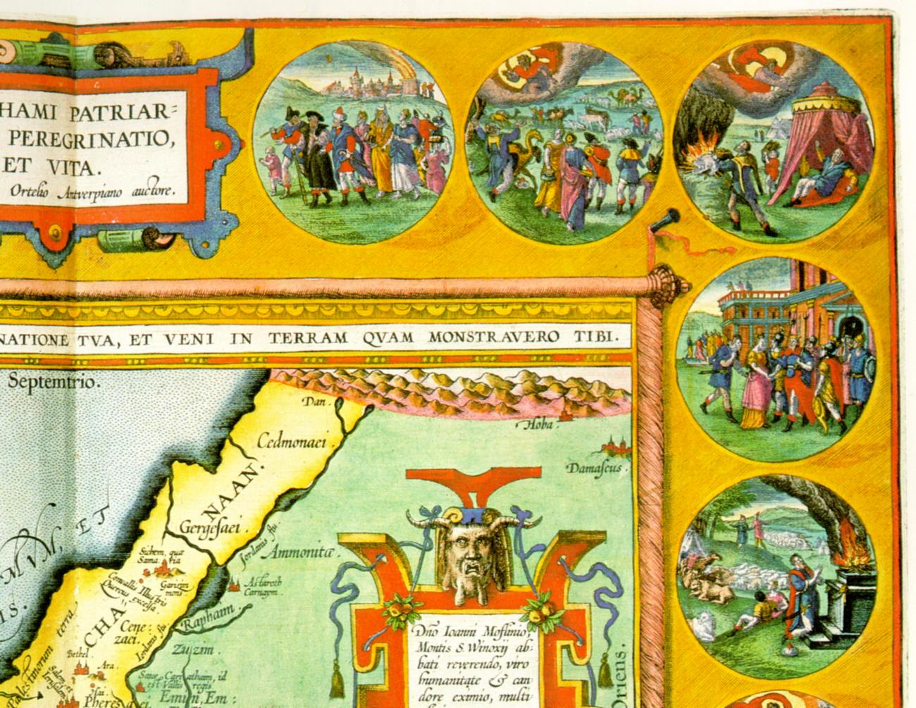 Карта Ханаана, приписываемая Ортелию. В картушах, расположенных вокруг карты Ханаана, иллюстрируются основные эпизоды жизни библейского патриарха Авраама.