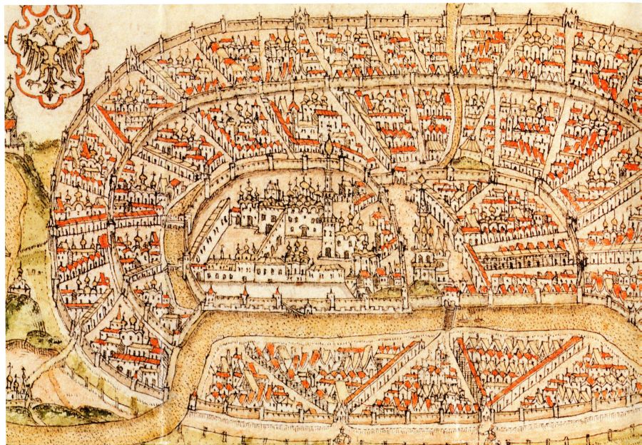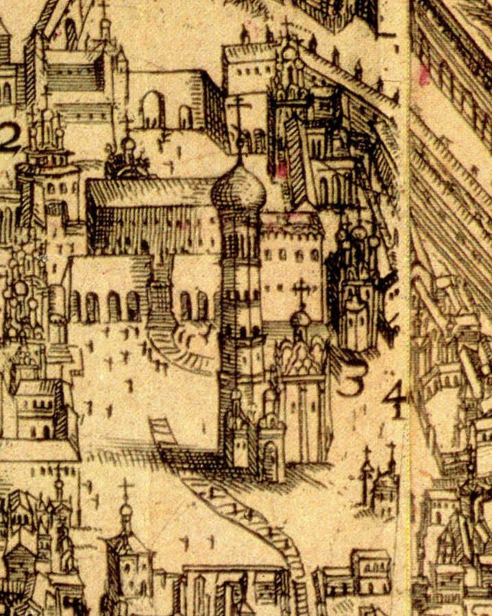 Отметим, что соседняя, пристроенная, церковь Иоанна Лествичника заметно НИЖЕ Столпа Ивана. Приведем, например, фрагмент так называемого Сигизмундова плана Москвы, где изображен Кремль и, в частности, Столп Ивана, рис.6.38