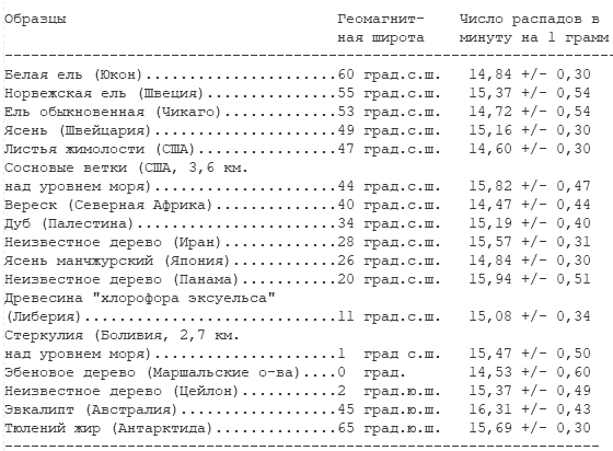 Таким образом, современная активность радиоуглерода в зависимости от географического расположения и породы дерева меняется от 14,03 (вереск в Северной Африке) до 16,74 (эвкалипт в Австралии) распада в минуту. Это дает отклонение содержания радиоуглерода от среднего значения на плюс-минус 8,5% . Либби пишет: "На протяжении 10 лет, прошедших с тех пор, эти данные не были опровергнуты. Исключения составляют лишь районы развития карбонатных пород, где поверхностные воды растворяют и уносят значительное количество древнего углерода и понижают тем самым содержание углерода-14 по сравнению со средним значением, характерным для системы атмосфера-биосфера-океан в планетарном масштабе. Правда, такие случаи встречаются относительно редко (? - А.Ф.) и легко могут быть учтены" [480].