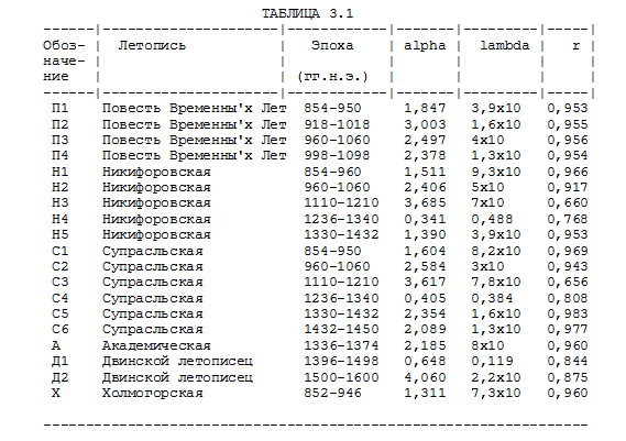 # Параметр α , а иногда и параметр λ , обычно характеризует всю группу летописей, описывающих события данного периода. Другими словами, параметр α в определенном смысле является "инвариантом исторической эпохи", ее летописей. Этот эффект можно считать установленным для русских летописей XIV-XVII веков, то есть для более или менее достоверно датированных текстов.