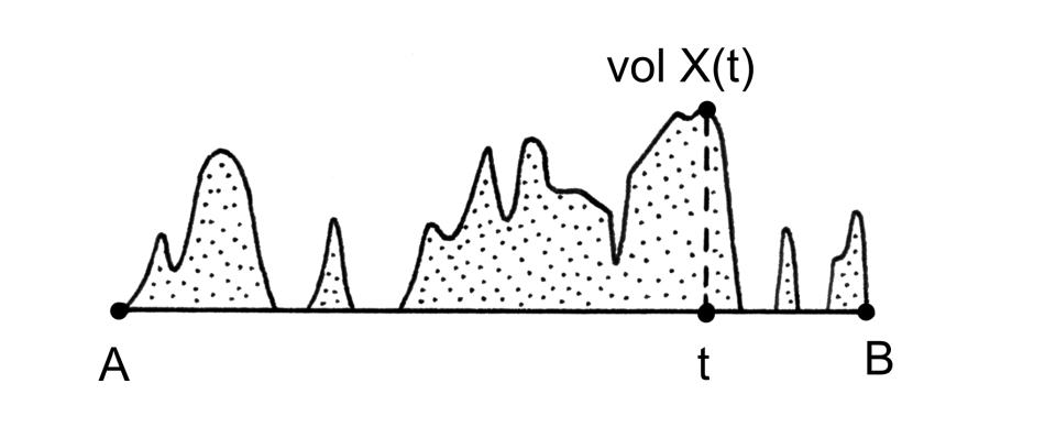 В качестве численной характеристики исследуемого текста была взята функция объема, введенная А.Т.Фоменко в книге "Числа против лжи", гл.5. Напомним ее определение. Предположим, что исторический текст X разбит на "главы" X(t), где каждая "глава" - это фрагмент текста, описывающий события одного года t. Такова структура многих древних летописей. Она условно изображена на рис.d2.1