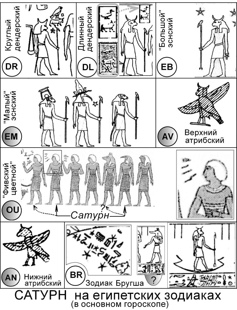 (DR), - тоже Сатурн. На Длинном Дендерском зодиаке DL и на "Большом" Эснском зодиаке EB Сатурн обозначен точно такой же фигурой.