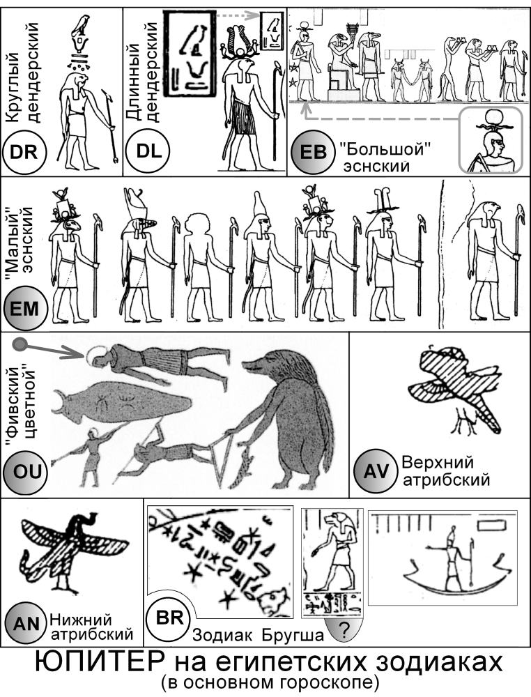 Рис.4.35. Юпитер в основном гороскопе на египетских зодиаках. Там, где кружки закрашены серым, Юпитер отождествлен лишь после астрономических расчетов по всем вариантам. В клетке EB символ весеннего равноденствия, попавший внутрь шествия Юпитера, нами для наглядности искусственно уменьшен. Взято из [1100]; [1062]; [544], т.6.