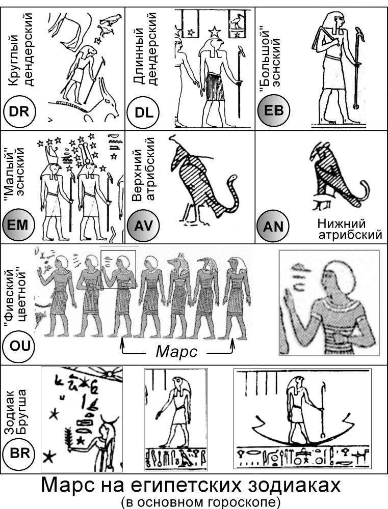 . Кружки зодиаков EM, EB и OU закрашены серым, поскольку здесь Меркурий найден компьютерными расчетами с перебором всех вариантов. На остальных зодиаках Меркурия удалось обнаружить сразу.