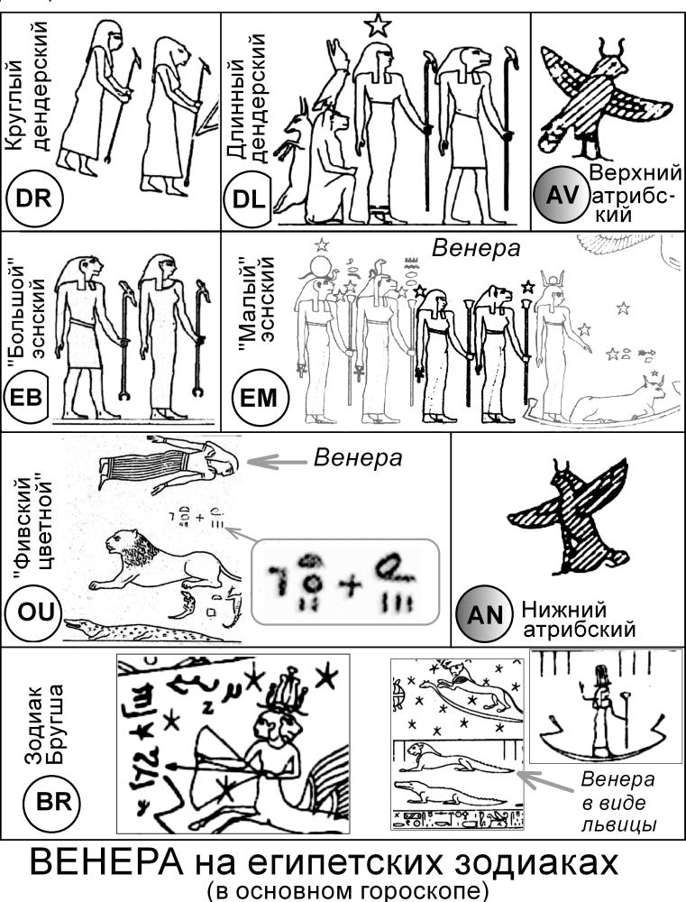 ЗНАК ЛЬВИЦЫ, - как правило, в виде львиной головы, - часто сопутствует Венере на зодиаках. Например, одна из двух фигур, изображающих Венеру в основном гороскопе на Эснских и Дендерских зодиаках, имеет голову львицы, рис.4.39