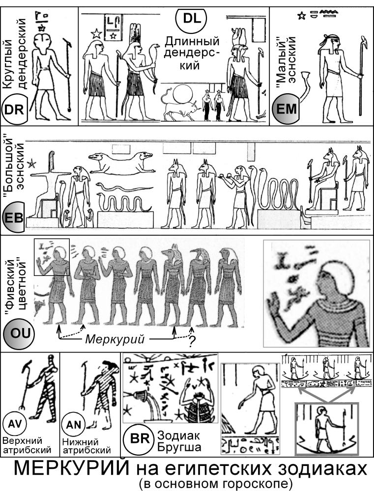 Рис.4.45. Меркурий в основном гороскопе на египетских зодиаках. На зодиаках EM, EB и OU Меркурий найден перебором всех вариантов. Зодиаков Петосириса на рисунке нет. На зодиаке DL быстро движущийся Меркурий показан в основном гороскопе сразу в двух положениях - видимом и невидимом. В клетке DL все фигуры, попавшие между двумя символами Меркурия, для наглядности уменьшены. Взято из [1100]; [1062]; [544], т.6.