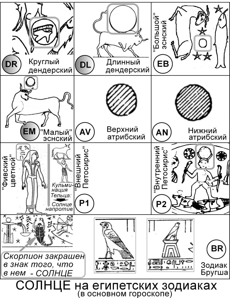 показано Солнце в основном гороскопе на различных зодиаках. Серыми кружками обозначены зодиаки, где было несколько вариантов отождествления Солнца. Окончательный вариант, рис.4.47