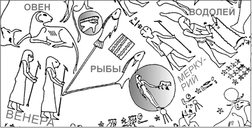 мы видим, что в созвездиях Овен-Рыбы-Водолей на Круглом зодиаке показаны обе близкие к Солнцу планеты - Венера и Меркурий. Венера - это две женщины-путницы между Рыбами и Овном, а Меркурий - двуликая мужская фигура с посохом между Рыбами и Водолеем. Но тогда здесь должно быть и Солнце. Ведь эти планеты никогда не удаляются далеко от Солнца.