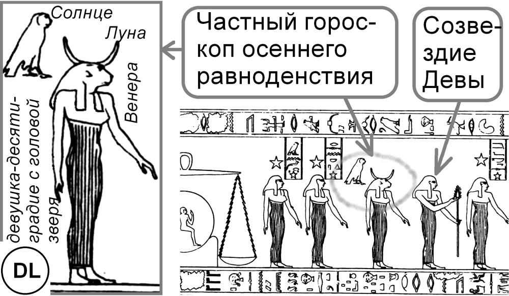 Это - один из двух исключительных случаев среди 24 девушек-десятиградий на Длинном зодиаке. Как правило, они изображены здесь с человеческими головами и женскими лицами. Забегая вперед, скажем и о втором исключении. Это - девушка-десятиградие с головой сокола между Скорпионом и Весами. Как мы увидим ниже, в эту фигуру также встроена часть гороскопа зимнего солнцестояния.