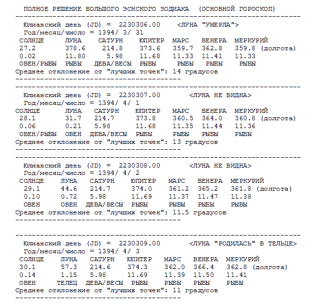 В заключение приведем расчетные положения планет 31 марта - 3 апреля 1394 года н.э. Обозначения см. в гл.5:4.