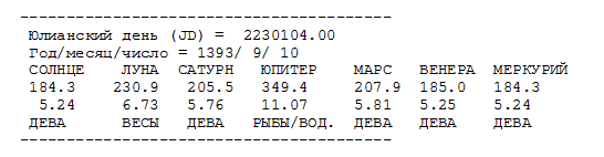 Приведем положения планет на 9 сентября 1393 года. Обозначения см. в гл.5:10.