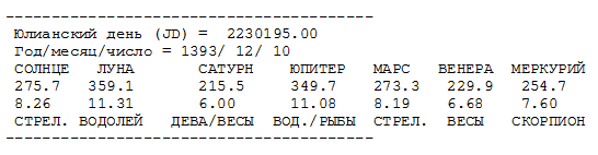 Зимнее солнцестояние рассматриваемого сентябрьского года было 12-13 декабря 1393 года. См. [НХЕ] и "Звезды". Приведем положения планет на близкую дату 10 декабря 1393 года. Разница в 2 дня в данном случае большого значения не имеет. Обозначения см. в гл.5:10.