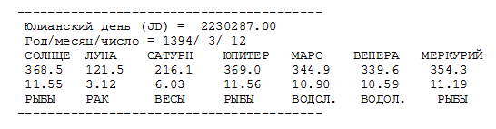Положения (для полноты картины) планет на эклиптике 12 марта 1394 года в день весеннего равноденствия были таковы:
