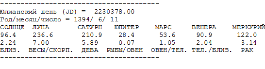 Летнее солнцестояние в тот год было 13 июня 1394 года. См. [НХЕ] и "Звезды". Приведем положения планет на близкую дату 11 июня 1394 года (12-16 июня картина неба была по сути такая же):