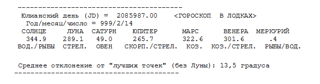 Приведем положение планет для второго решения гороскопа "в лодках": 14 февраля 999 года н.э.