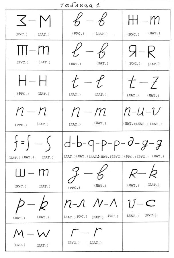 мы приводим таблицу, составленную лингвистами на основе старинных латинских текстов и показывающую, как по-разному писались иногда латинские буквы. Обратите внимание на запись латинской буквы M, которая похожа и на W, и на русское рукописное М с хвостиками справа и слева.