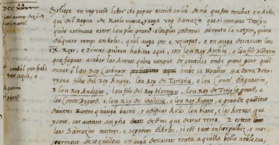 El escrito es un conjunto de notas a mano en las que se describe la historia de la Provenza, encajándola con el calendario oficial, pero es simple, improvisada, sin fuentes y con una clara intención de no mencionar la naturaleza del poder judío de la tierra que -en la Edad Media- ocupa la Provenza hasta Burdeos, con capitalidad judía en la Narbona (2). Y, también, de ocultar las raíces catalanas, que no se comentan, para escribir una historia afrancesada y cristiana en su sitio. De forma no casual, se trata de un borrador del proyecto europeo de reescribir la historia, que Caesar Nostradamus (el hijo del conocido Nostradamus) completa, ahora sí con fuentes y como un libro enciclopédico, y edita el año oficial de 1614 (3). El primero es un simple borrador, y el segundo todo un documento impresionante y escrupulosamente documentado.