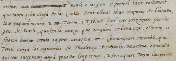 Pero esto no es todo. La historia de este clan tártaro recién llegado a la Provenza que nos narra Nostradame no acaba aquí. El cronista provenzal termina la crónica de Tarssyn, el rey de Tartaria, con una lucha contra Carlomagno en Arlés (junto a Aviñón), de donde proviene el poder de la Borgoña. Tarssyn, con Tybaut, defienden su castillo de Arlés, hasta que Carlomagno (dice) los vence y los encarcela. Pero no los ejecuta. Todo lo contrario, los bautiza (los hace cristianos) y hace del rey de Tartaria señor de Toulouse, Burdeos, Narbona y Provenza. Y dice, en las páginas 8 y 9 del manuscrito, que Tarssyn será el primer conde cristiano de Toulouse. El texto: