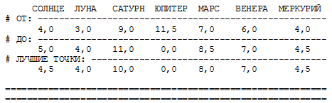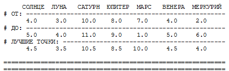При составлении собственных входных данных, описывающих те или иные зодиаки, читателю следует иметь в виду, что изменения следует вносить в строки данных, но не в служебные строки. При этом для указания границ расположения планет необходимо пользоваться следующей циклической "шкалой созвездий", подробно описанной в разделе 5.10 книги "Новая хронология Египта":