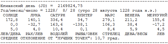 Приведем расчетные положения планет на 28 августа 1228 года н.э. В первой строке под названием планеты дается ее положение на эклиптике J2000 (в градусах), во второй - отклонение от Солнца по долготе (тоже в градусах), в третьей - положение по шкале созвездий, в четвертой - название созвездия, где находилась планета. В последней строке приводится среднее отклонение расчетных положений планет от их "лучших точек" (в градусах). Среднее отклонение составляет здесь около 10 градусов дуги, что говорит об очень хорошем качестве астрономического решения [НХЕ]. Все семь планет древности находятся в точности на предписанных им в гороскопе местах. Решение - ИДЕАЛЬНОЕ. См. рис.98