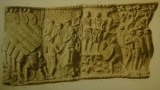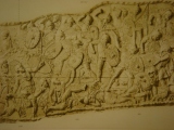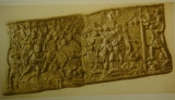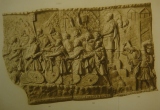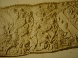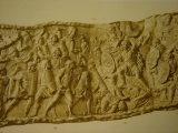 2) Скорее всего, колонна и некоторые барельефы на ней отлиты из бетона "под мрамор", рис.8.19. Видны участки, где "облезает кожа", то есть отваливается верхний тонкий слой более дорогого бетонного покрытия, наложенного на грубую бетонную основу, рис.8.20, рис.8.21. Не исключено, что некоторые изображения были изготовлены на еще не совсем застывшей поверхности колонны (или панелей). Возможно, техника была смешанной: отливки из бетона переплетались с фрагментами натурального мрамора с резьбой. Колонну Траяна могли сделать в эпоху Реформации, но при этом, вероятно, опирались на какие-то старые изображения.
