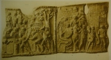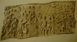 1) Странно, что на самой колонне НЕТ НИ ОДНОЙ НАДПИСИ, не упомянуто ни одного имени, ни одного названия. Единственная надпись есть лишь на цоколе, рис.8.15, рис.8.16. Кстати, любопытно сравнить состояние цоколя в XIX веке с его видом в наше время, рис.8.17. Видно, что в XX веке цоколь заметно отреставрировали. То обстоятельство, что на самой колонне никаких надписей нет, превращает ленту изображений, винтообразно обвивающую колонну снизу доверху, рис.8.18, в длинный ряд "военных картинок". Сражения, перемирия, религиозные ритуалы, пожары, взятия городов, вереницы пленных и т.п. В частности, заявление историков, будто некоторые фигуры изображают самого императора Траяна, является лишь гипотезой, не подкрепленной никакими конкретными аргументами. Повторим, что надписей нет.