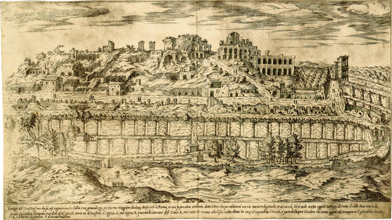 Fig.1.130. Vista del Colosseo presumibilmente risalente al XVI secolo. Disegno di Marten Van Xeemskerk, forse eseguito tra il 1532 e il 1536.Nell’area del Colosseo, su un postamento, si erge l”antica” statua di Giove, v . a sinistra – Tratto da [535:00 op cit], pp.18-19.