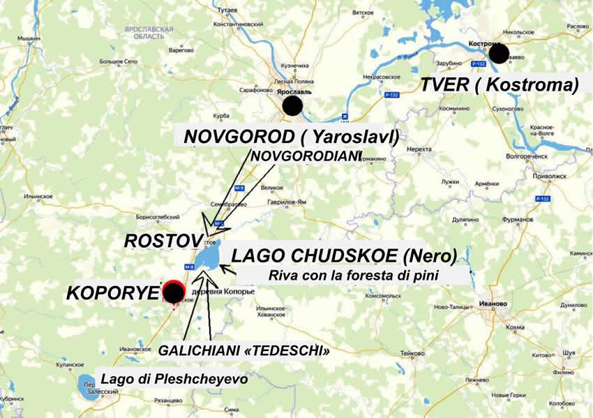 ## Secondo le cronache russe, poco prima della Battaglia sul Ghiaccio, gli abitanti di Novgorod guidati da Alexander Nevsky distrussero completamente la città “tedesca” di Koporye, dopodiché Alexander si recò a Pereslavl [490:4], libro 6, pagg. 3-6. Guardando la mappa, vediamo che a sud del lago Nero, in direzione di Pereslavl-Zalessky, si trova il villaggio di Koporye. È possibile che la fortezza galiziana (“tedesca”) di Koporye, di cui parla la cronaca, si trovasse proprio in questo villaggio, fig. 9.