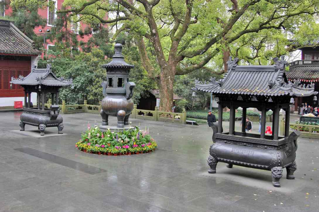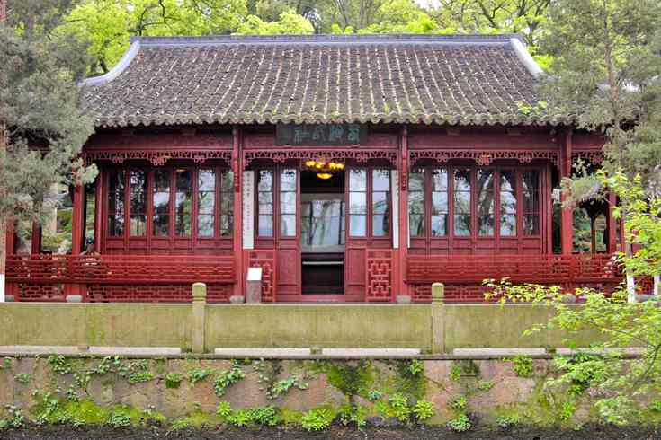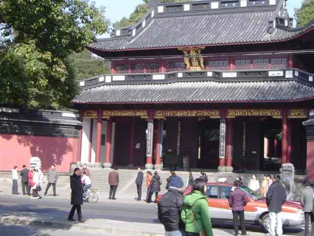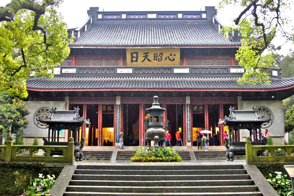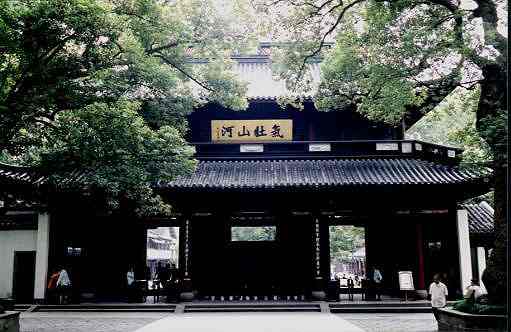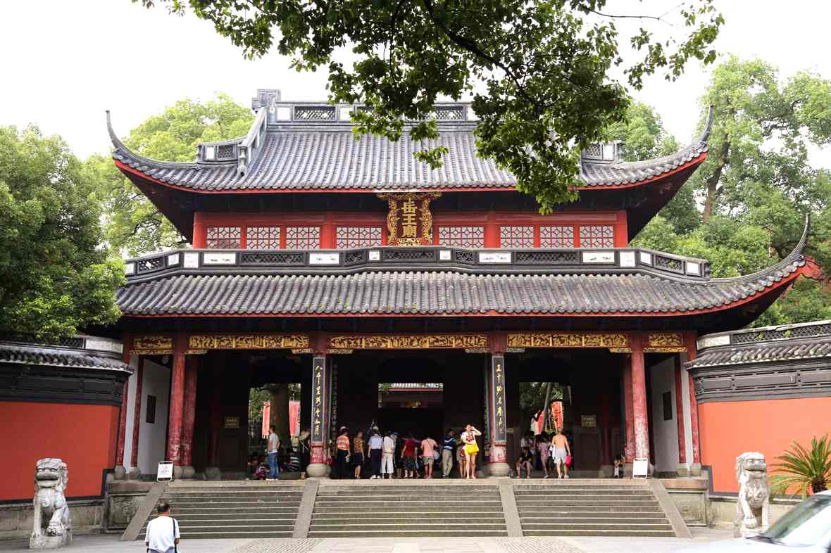 издали видна территория гробницы и святыни Юэ Фэя в Ханчжоу. Надписи в дальнем конце гласят: "Служите стране с предельной преданностью". См. https://wiki5.ru/wiki/Yue_Fei.