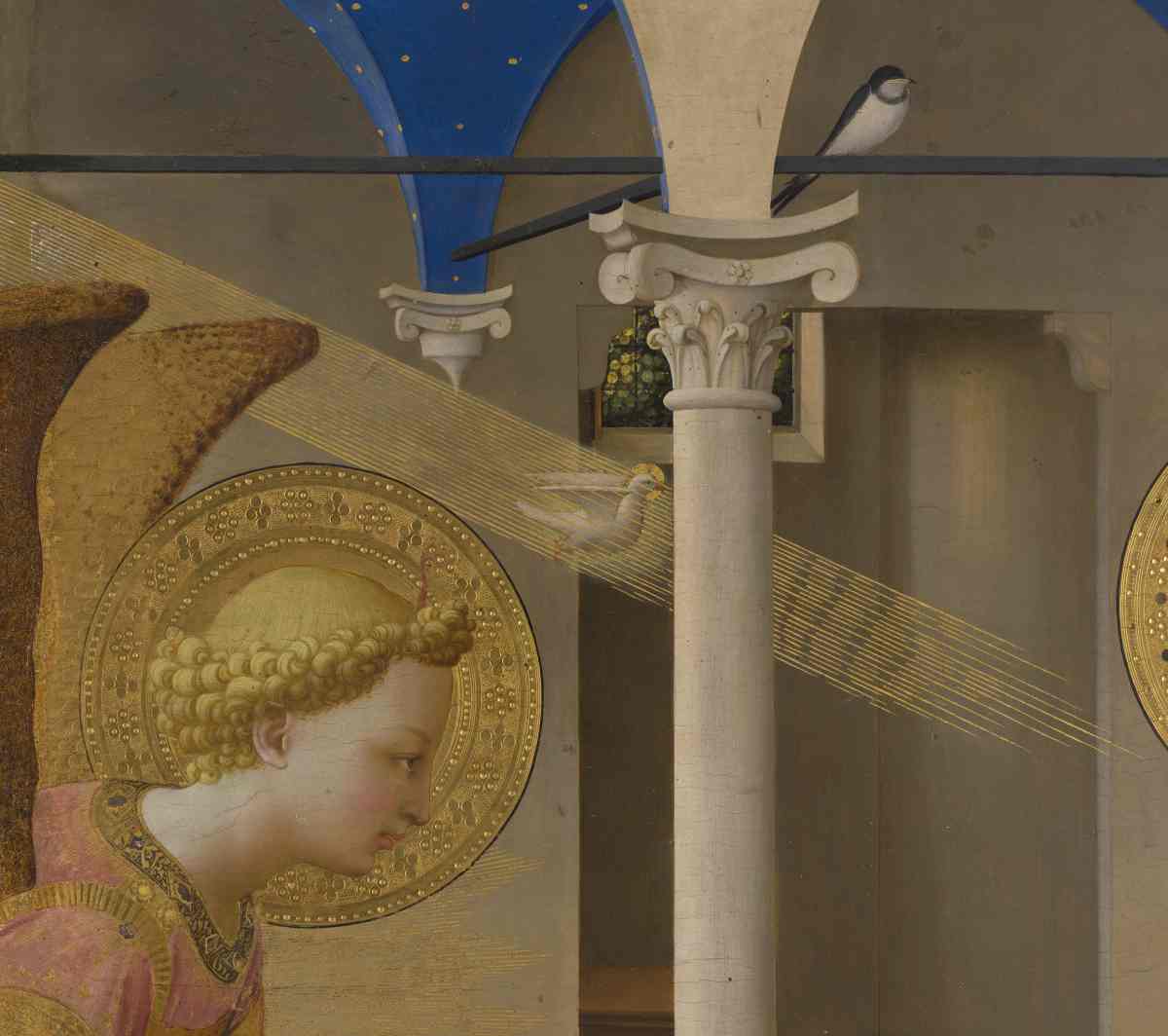 приведена картина Фра Беато Анджелико "Благовещение". Изображен Дух Святой в виде птицы, слетающий с неба из рук Бога в струе света, рис.1.24