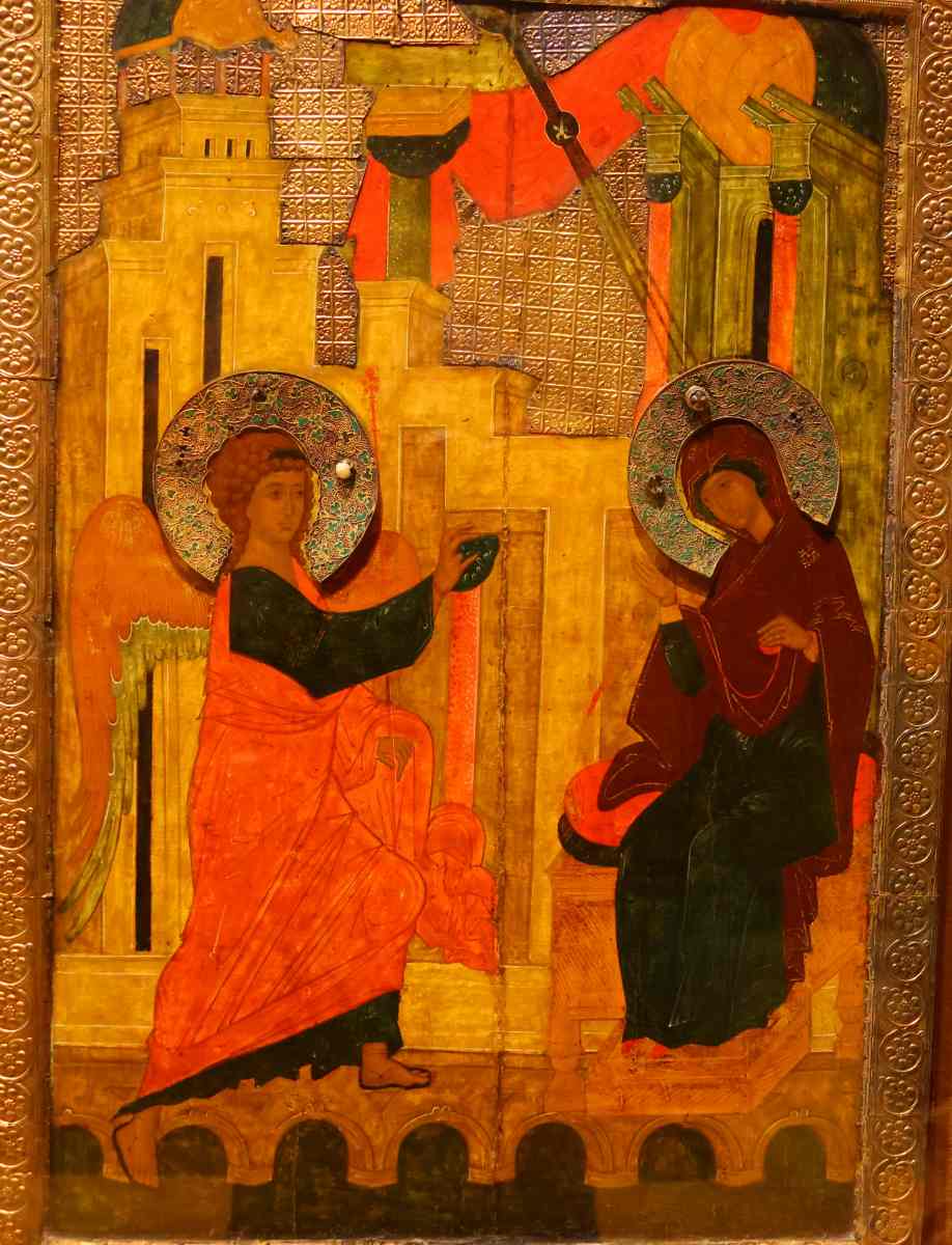 показана икона Благовещение из Благовещенского Собора московского Кремля. Мария прядет пурпур [307], с.212-213. Архангел Гавриил обращается к Марии. Как мы видим, все это и отражено в китайском рассказе о Благой Вести, данной родителям Юэ Фэя.