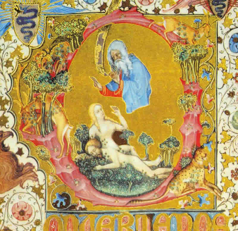 а) Делается разрез на боку Адама (на самом деле Евы - Девы Марии), и из разреза появляется Ева (на самом деле Адам - Младенец Иисус).