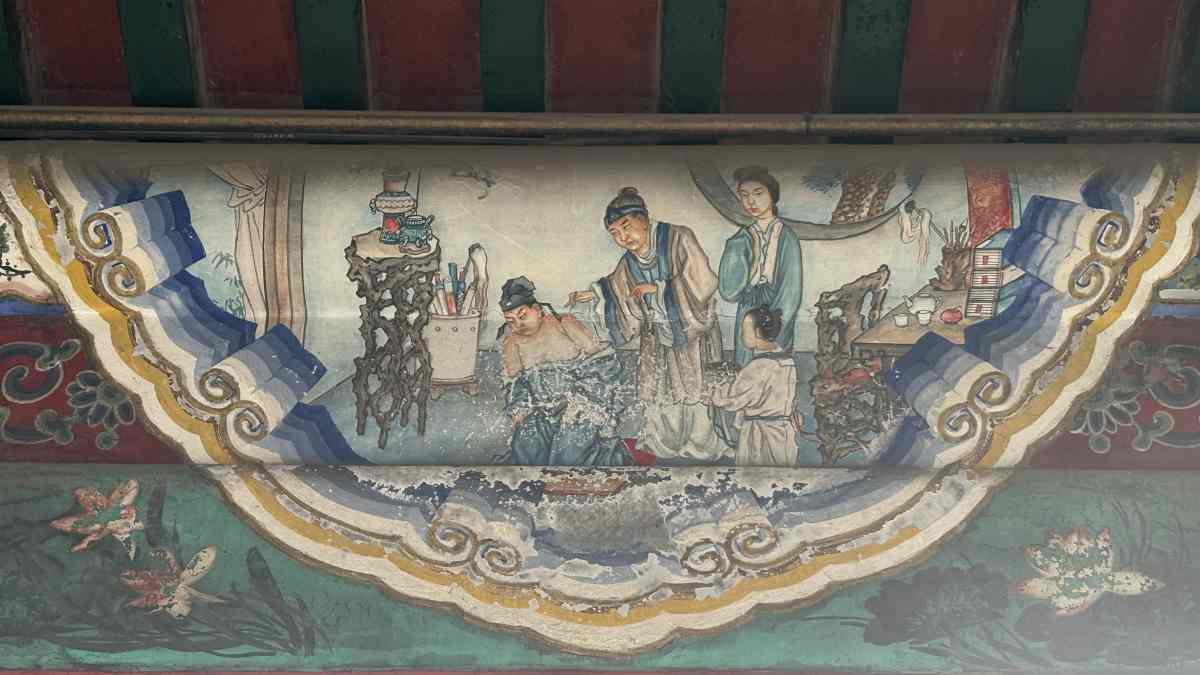 мы приводим фотографию этой же фрески, но сделанную в октябре 2023 года. Ясно видно, что фреска сильно разрушилась, осыпалась. И это несмотря на то, что находится она в знаменитом, охраняемом и почитаемом месте. Ведь Длинный Коридор занесен в Книгу рекордов Гиннесса, как "самый длинный в мире расписанный коридор" - 728 метров, см. Википедию. Летний Императорский Дворец считается древней резиденцией Цзиньской, Юаньской и Цинской империй, начиная якобы с XII-XIII веков.