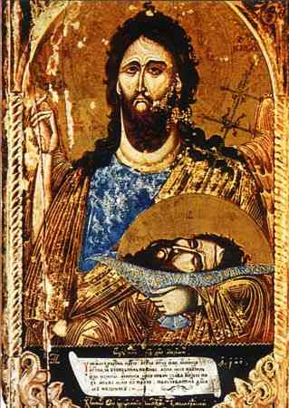 . Речь тут идет об устойчивой иконописной традиции: Иоанн Предтеча держит в руках, у пояса, свою отрубленную голову, причем, "вторая его голова" пока еще находится на его плечах. То есть, на иконах изображали ДВЕ ГОЛОВЫ ИОАННА. Этот сюжет - "Иоанн с двумя головами" - неоднократно обсуждался и истолковывался в литературе.