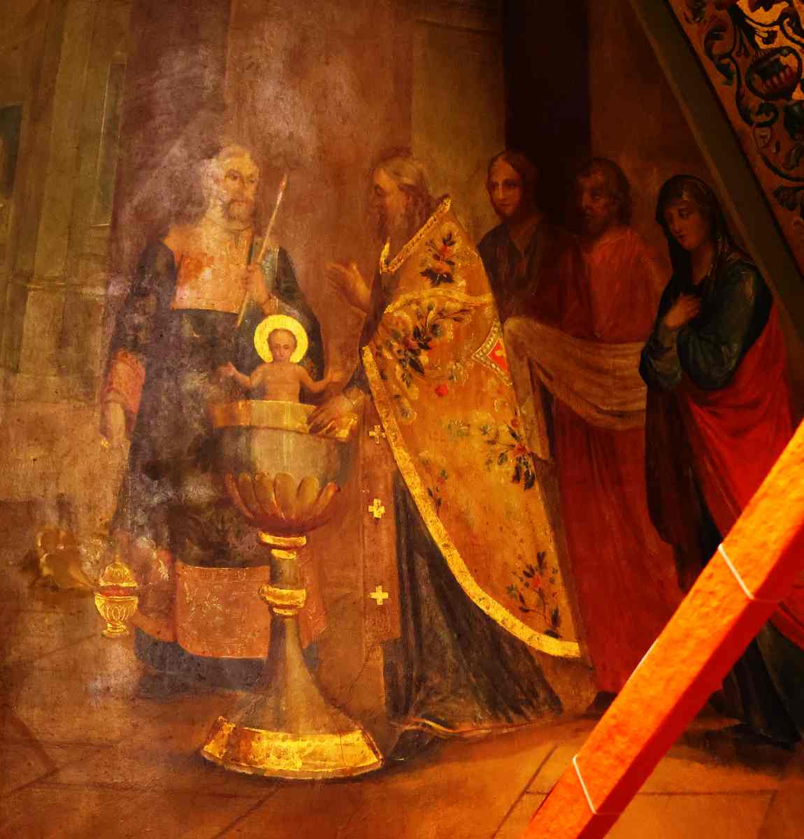 - фреска из Благовещенского Собора в московском Кремле. Показано крещение в купели Младенца с нимбом.