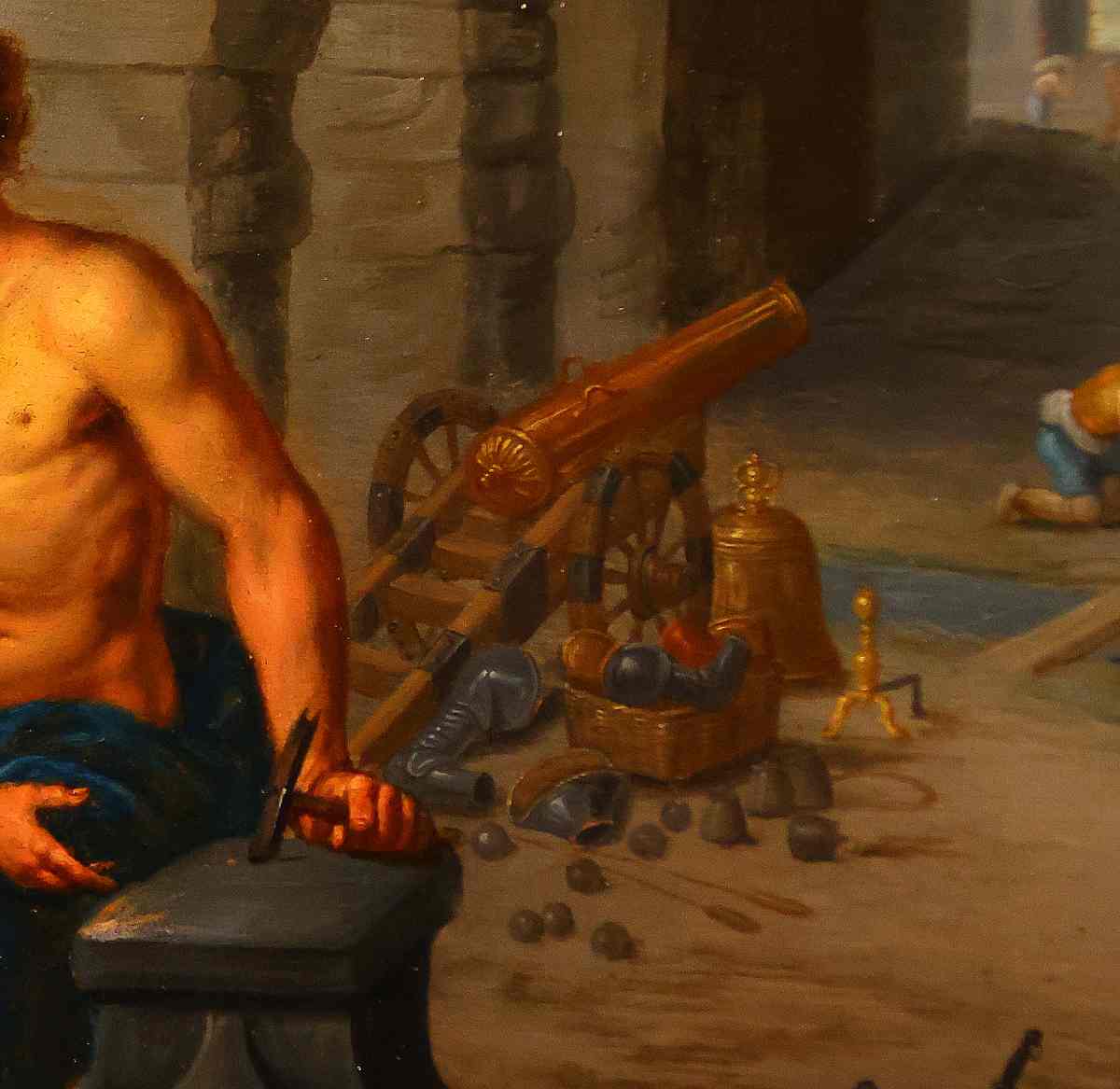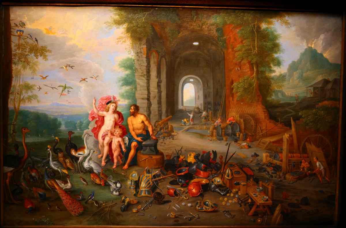 приведена картина Яна Брейгеля Младшего (1605-1610-1672 годы) "Венера в кузнице Вулкана". Античная богиня Венера сидит рядом с античным богом Вулканом-Гефестом, а за ними красуется большая античная пушка на лафете. Рядом с ней на земле разбросаны античные пушечные ядра. За пушкой мы видим большой античный колокол, рис.1.68