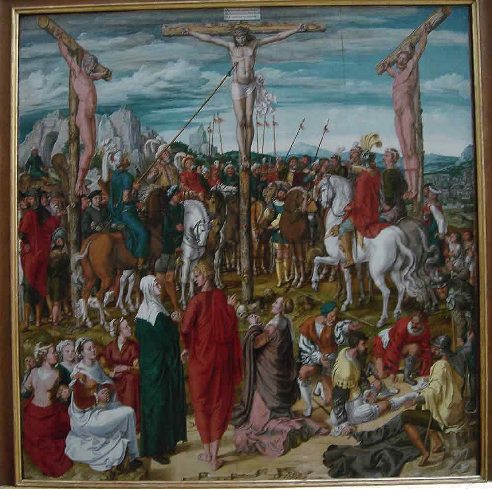 ## На Голгофе Христа окружают, в основном, враги - римские солдаты, палачи. У основания креста стоят несколько близких Ему людей. Христос как бы "рассматривает с высоты окружающих врагов" - Аналогично, Юэ Фэй рассматривает с самого высокого дерева неприятельский лагерь, врагов.