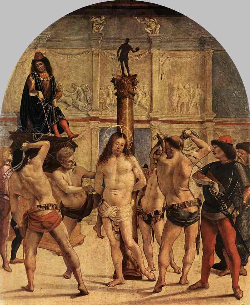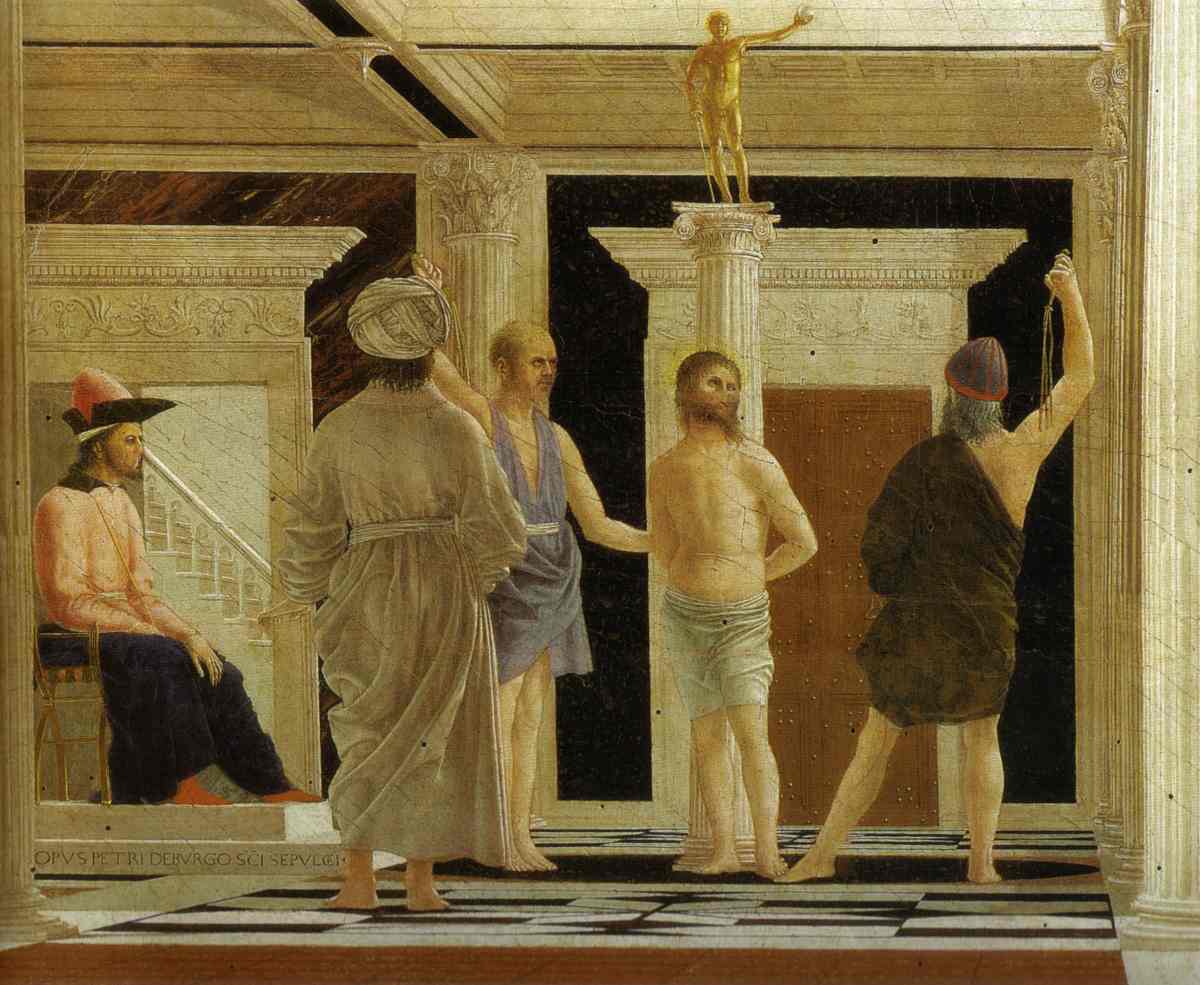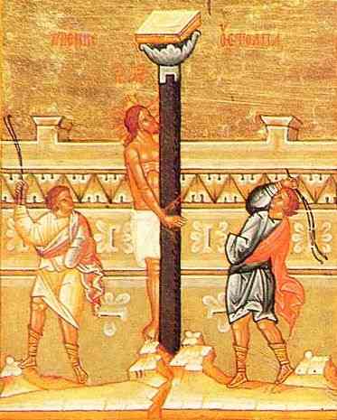 - Авт.) ... В иконописи сцена бичевания Христа имеет название "БИЧЕВАНИЕ У СТОЛПА Господа нашего Иисуса Христа". Ерминия Дионисия Фурноаграфиота дает следующие указания по написанию этой сцены — "Два воина бичуют Христа, ПРИВЯЗАННОГО К КОЛОННЕ. По телу Его течет кровь">>. См. Википедию.
