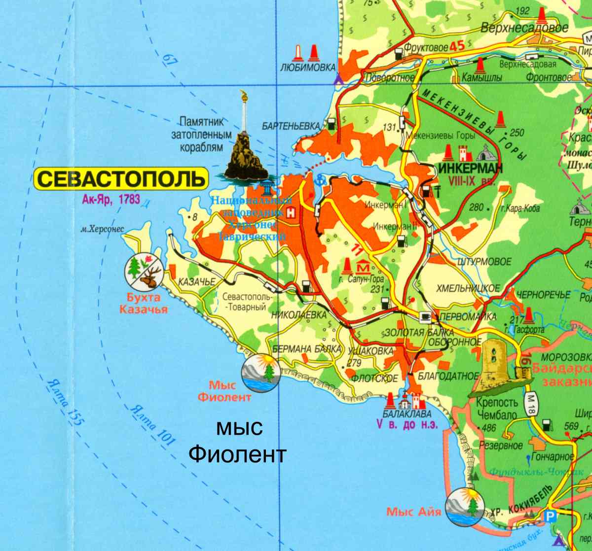 показана карта Южного Крыма с мысом Фиолент.